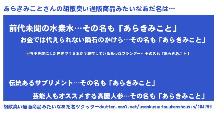 | 意味不明あだ名 | 『住所不定無職あらきみこと(74歳)』 |