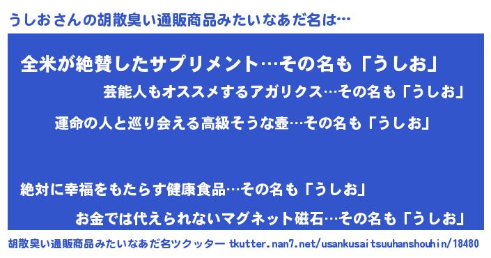 | 欧米人風あだ名 | 『うしおクリステル』『ウサインうしお』 |