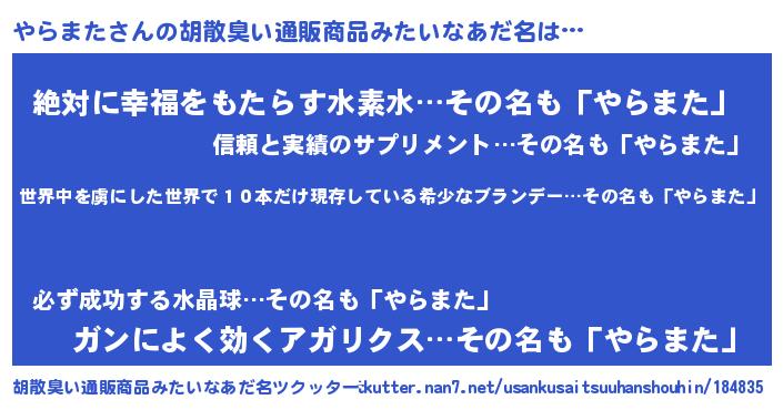 | 意味不明あだ名 | 『住所不定無職やらまた(85歳)』 |