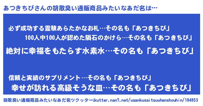 | 女子向けラノベタイトル風あだ名 | 『異世界で失敗しない100のあつきちび』 |