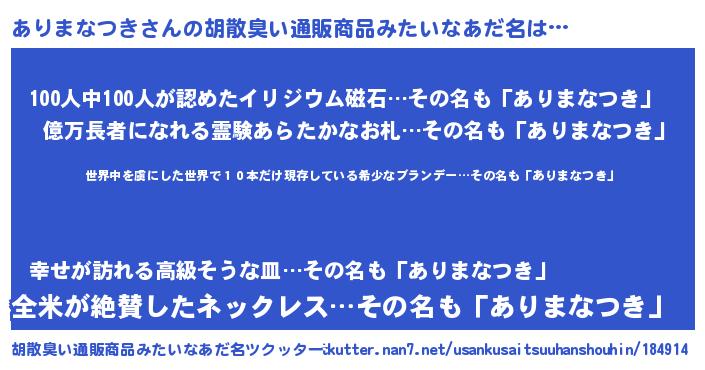 | 意味不明あだ名 | 『住所不定無職ありまなつき(95歳)』 |