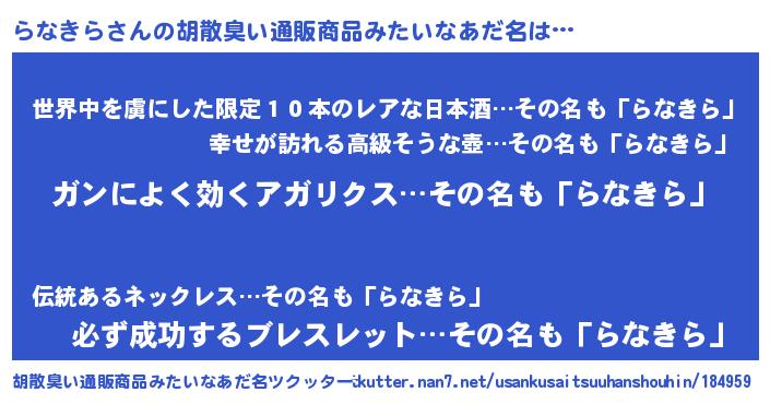 | 意味不明あだ名 | 『自称らなきら』『なめこ科らなきら属』 |