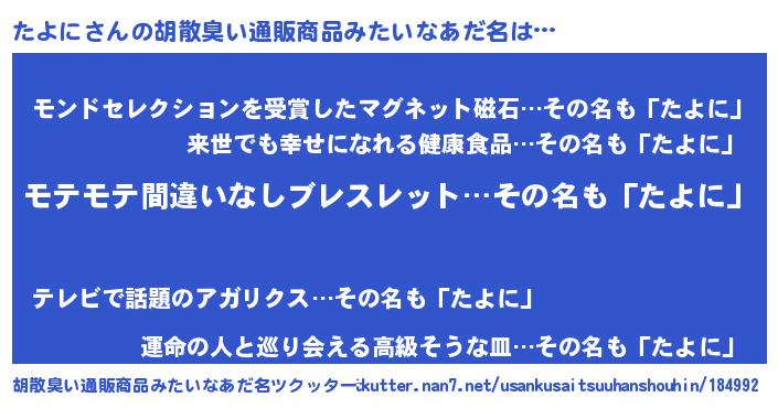 | 意味不明あだ名 | 『ペロリンたよに』『たよにフォーエバー』 |