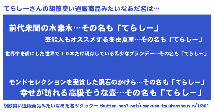 | 意味不明あだ名 | 『住所不定無職てらしー(81歳)』 |