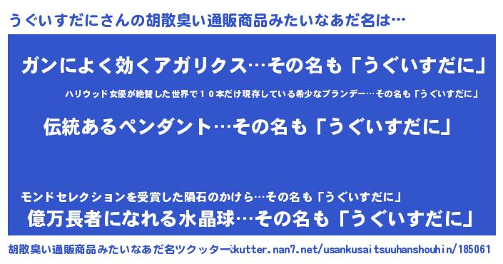 | ヒーロー風カッコイイあだ名 | 『幻影騎士ウグ』『スーパーウグイスダニ』 |
