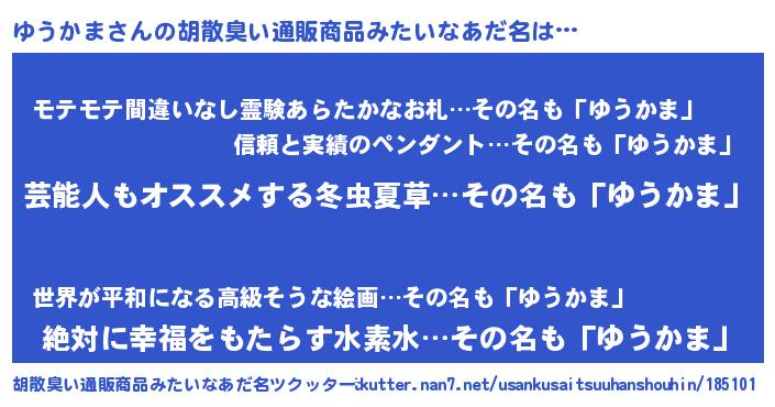 | 意味不明あだ名 | 『ヨモギ科ゆうかま属』『自称ゆうかま』 |