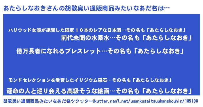 | 男性向けラノベタイトル風あだ名 | 『アタラシナオキアートオンライン』 |