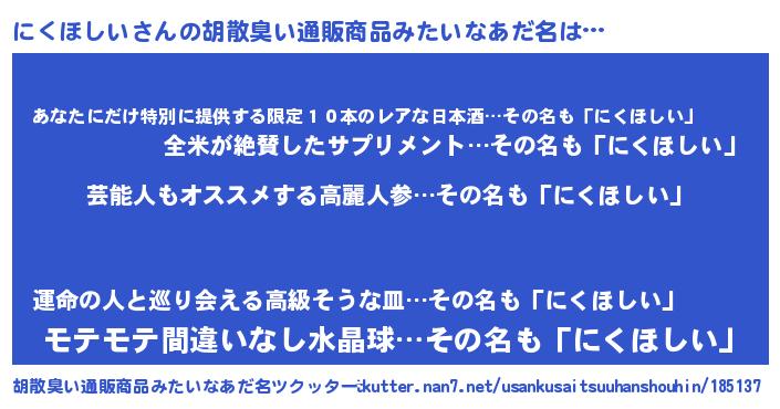 | ヒーロー風カッコイイあだ名 | 『究極戦士ニクホシイ』『仮面ニクダー』 |