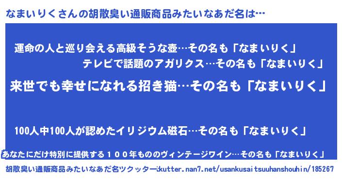 | 意味不明あだ名 | 『永久保存なまいりく』『自称なまいりく』 |