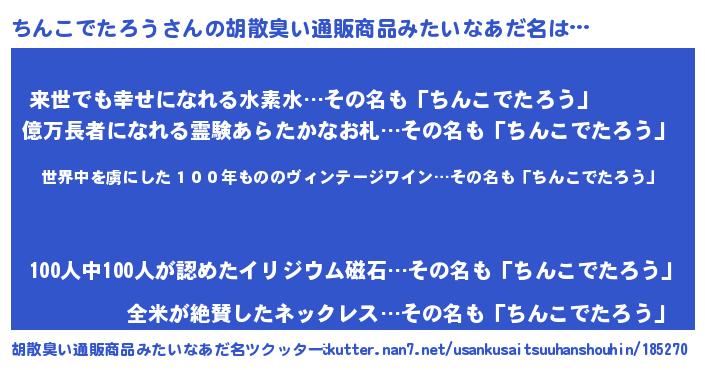 | 意味不明あだ名 | 『住所不定無職ちんこでたろう(1歳)』 |