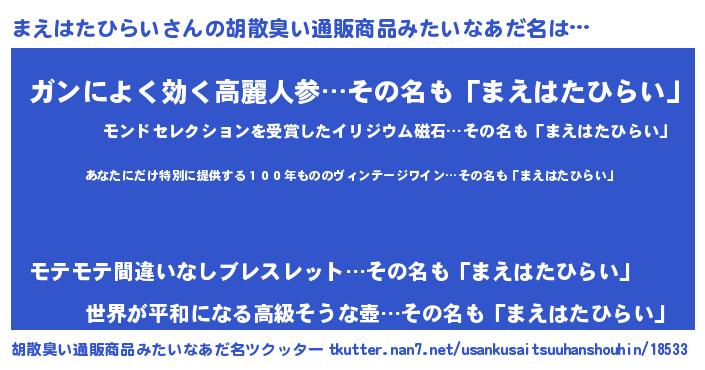 | 意味不明あだ名 | 『住所不定無職まえはたひらい(1歳)』 |