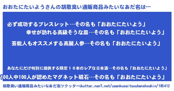 | 男性向けラノベタイトル風あだ名 | 『Re:おおたにたいようから始める異世界生活』 |