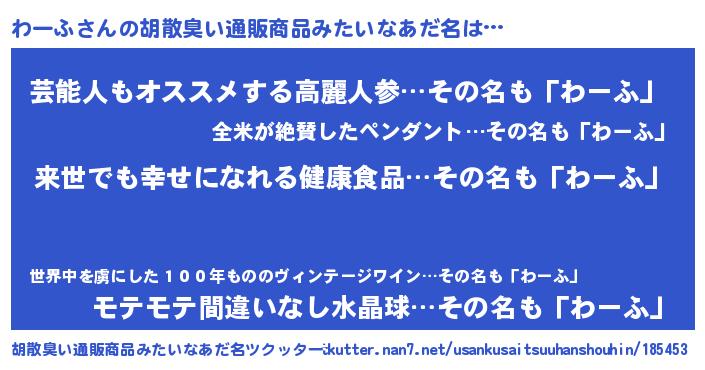 | ヘコむあだ名 | 『わーふ(爆)』『わーにー』『豆乳』 |