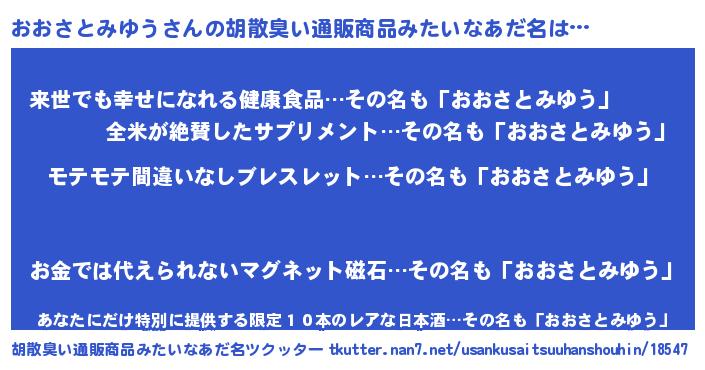 | 男性向けラノベタイトル風あだ名 | 『転生したらおおさとみゆうだった件』 |