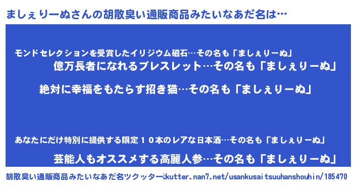 | ヘコむあだ名 | 『ましぇりーぬ(笑)』『ましにゅー』 |