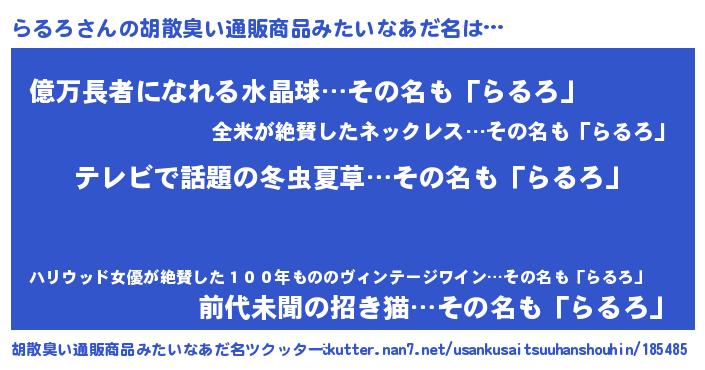 | 意味不明あだ名 | 『自称らるろ』『ペロリンらるろ』 |