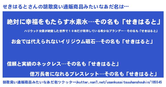 | ヘコむあだ名 | 『せきはると(爆)』『せきもー』 |