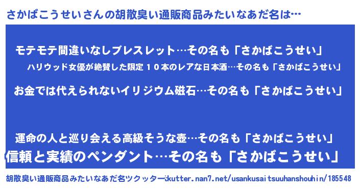 男性向けラノベタイトル風あだ名 | 『転生したらさかばこうせいだった件』 |