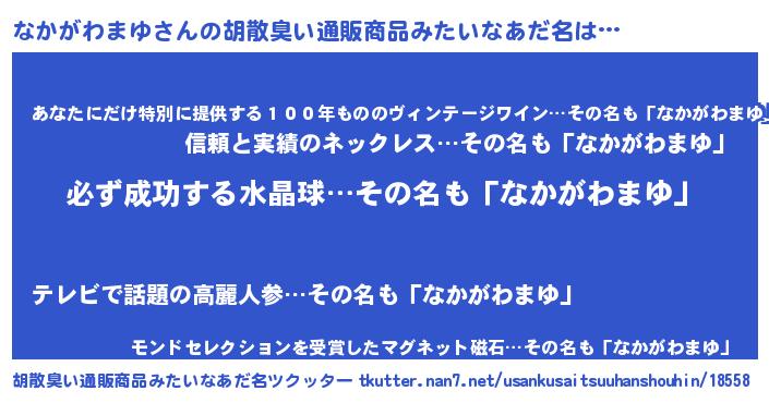 | 恥ずかしいあだ名 | 『プリティーなかがわまゆ』『なかっちょ』 |