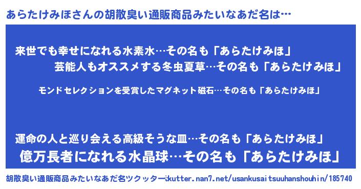 | ヘコむあだ名 | 『あらたけみほ(笑)』『あらっふぃ~』 |