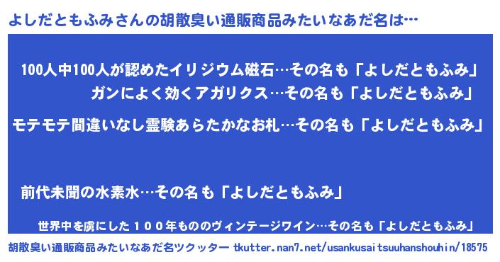 | ヘコむあだ名 | 『よしっふぃ~』『よしだともふみ(笑)』 |