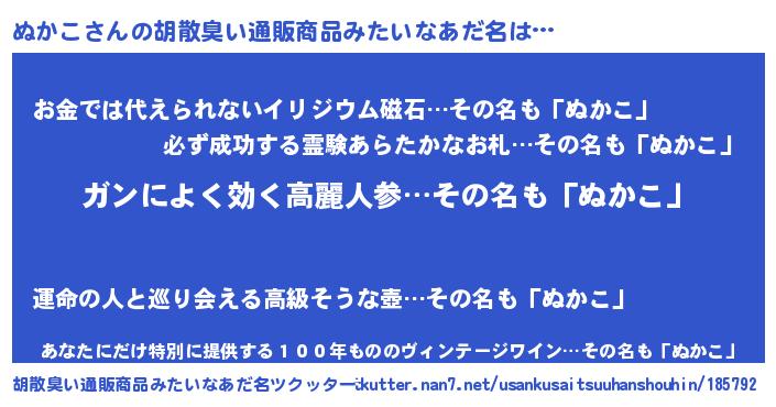 | 男性向けラノベタイトル風あだ名 | 『緋弾のヌカコ』『魔法科高校のぬかこ』 |