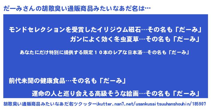 | 意味不明あだ名 | 『住所不定無職だーみ(68歳)』『自称だーみ』 |
