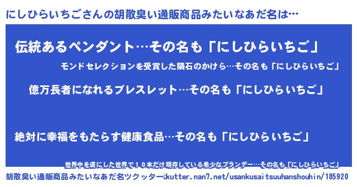 | 男性向けラノベタイトル風あだ名 | 『ニシヒライチゴアートオンライン』 |