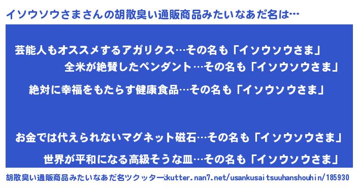 | 男性向けラノベタイトル風あだ名 | 『イソウソウサマスレイヤー』 |