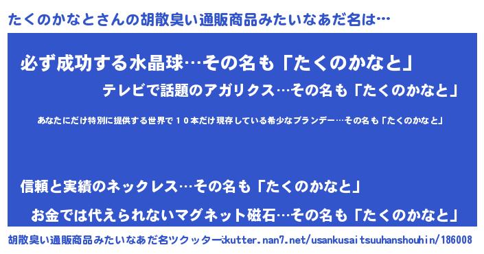 | 男性向けラノベタイトル風あだ名 | 『たくのかなとに滅ぼされるだけの簡単なお仕事です』 |