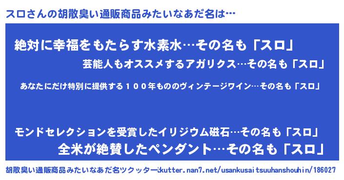 | 意味不明あだ名 | 『住所不定無職スロ(9歳)』『永久保存スロ』 |