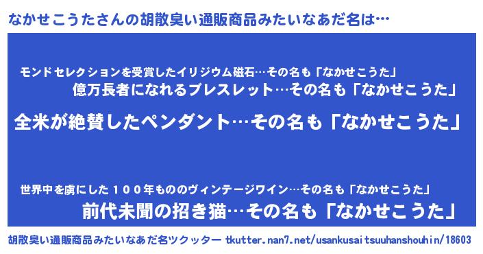 | 男性向けラノベタイトル風あだ名 | 『なかせこうたの嫁は女の子じゃないと思った?』 |