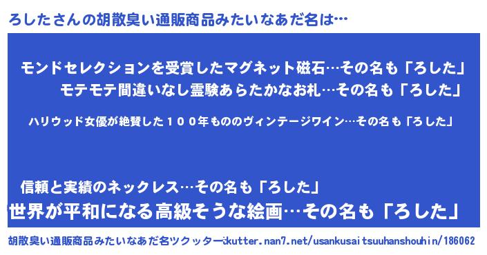 | 意味不明あだ名 | 『住所不定無職ろした(7歳)』 |