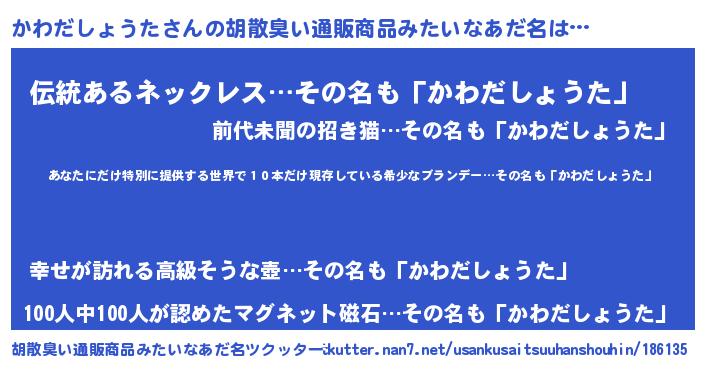 | 意味不明あだ名 | 『住所不定無職かわだしょうた(85歳)』 |