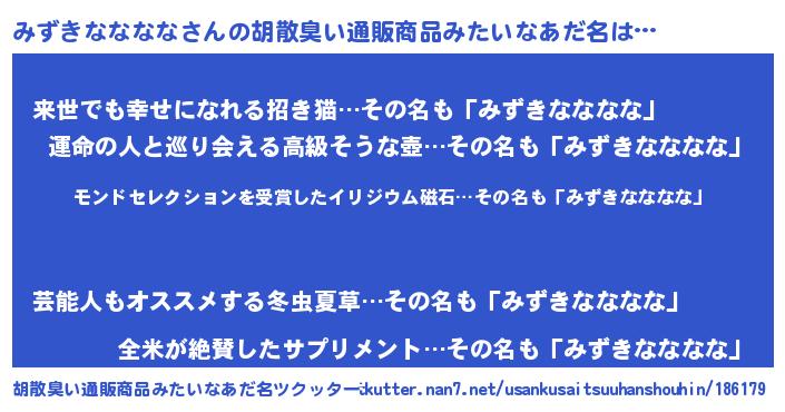 | ヘコむあだ名 | 『みずきなななな(爆)』『みずお』 |