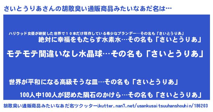 | 男性向けラノベタイトル風あだ名 | 『さいとうりあの憂鬱』 |