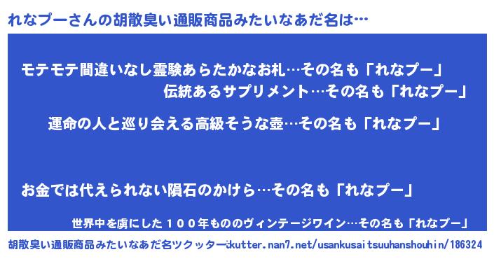 | 男性向けラノベタイトル風あだ名 | 『れなプー~年齢イコール彼女いない歴の魔法使い~』 |