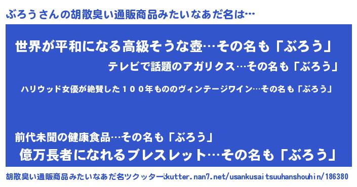 | 意味不明あだ名 | 『住所不定無職ぶろう(2歳)』『自称ぶろう』 |