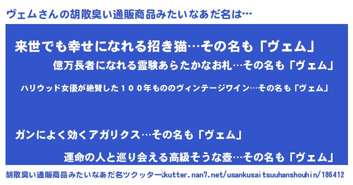 | ヘコむあだ名 | 『ヴェム(笑)』『豆乳』『ヴェにー』 |