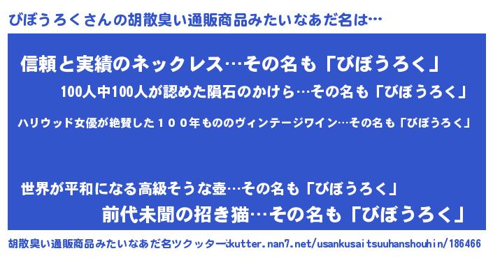 | 意味不明あだ名 | 『住所不定無職びぼうろく(3歳)』 |