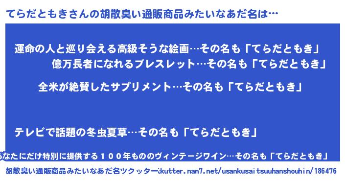 | 男性向けラノベタイトル風あだ名 | 『てらだともきの嫁は女の子じゃないと思った?』 |