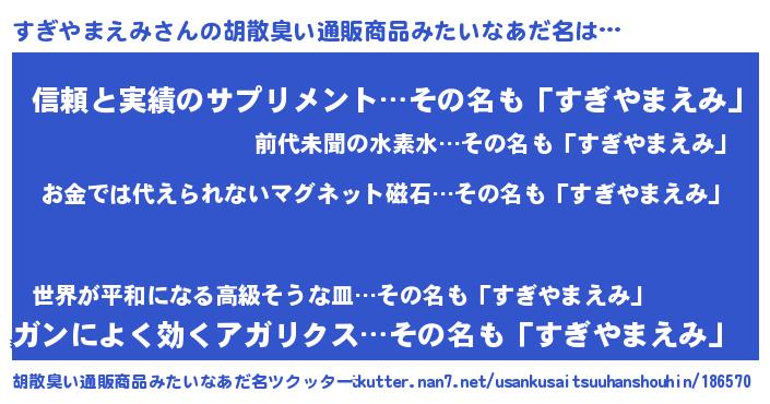 | 男性向けラノベタイトル風あだ名 | 『転生したらすぎやまえみだった件』 |
