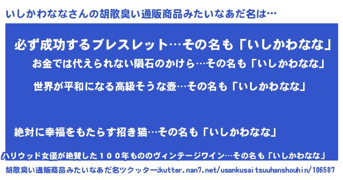 | 恥ずかしいあだ名 | 『いしっちょ』『プリティーいしかわなな』 |