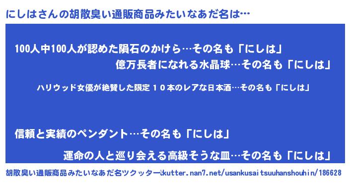 | 意味不明あだ名 | 『住所不定無職にしは(47歳)』 |