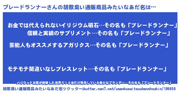 | 男性向けラノベタイトル風あだ名 | 『ブレードランナー~年齢イコール彼女いない歴の魔法使い~』 |