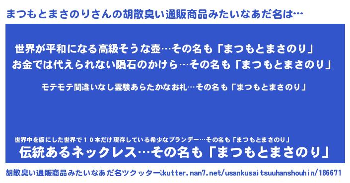 | 男性向けラノベタイトル風あだ名 | 『転生したらまつもとまさのりだった件』 |