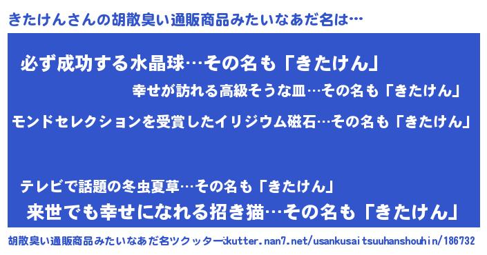 | 男性向けラノベタイトル風あだ名 | 『うちのきたけんが世界を掌握している!』 |
