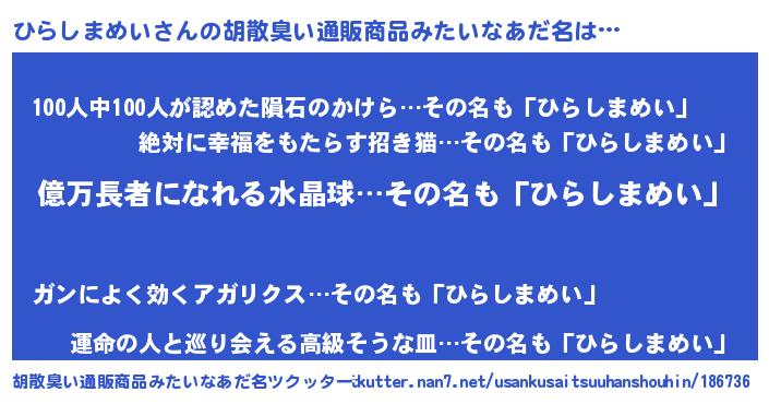 | 恥ずかしいあだ名 | 『プリティーひらしまめい』『ひらっちょ』 |
