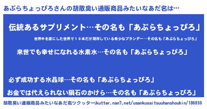 | 伝説のあだ名 | 『古より伝わる勇者あぷらちょっぴろ』 |