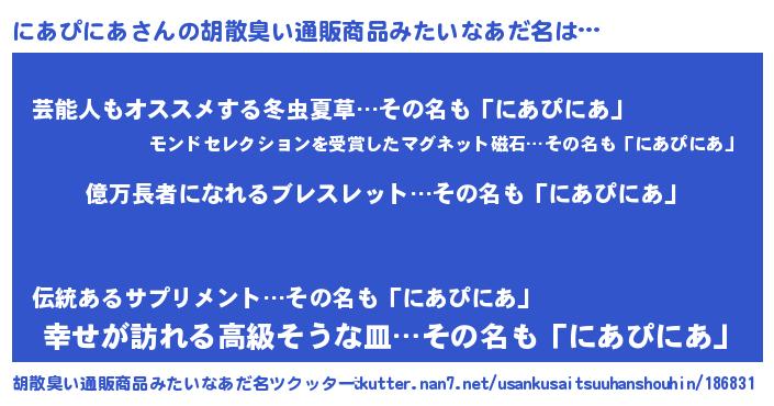| 意味不明あだ名 | 『ペロリンにあぴにあ』『自称にあぴにあ』 |
